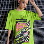 Green TALLYDEGA Oversized T-Shirt Dress, in Cotton Jersey fabric, Unlined , Above Knee, Oversized Fit, No Closure, Straight Hemline and features Print At Front