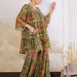 Green Tie & Dye Coin Lace Tired Kurta With Sharara Pants , in Georgette fabric, Butter Crepe Lining, Below Knee, Comfort Fit, Zipper Closure, Flared Hemline and features Coin Lace Detail At Front