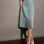 Green Washed Denim A-Line Skirt, in Cotton Denim fabric, Unlined, Knee Length, Fit and Flare, Button Closure, Flared Hemline and features Button Detail At Front