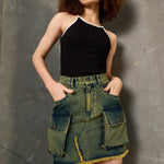 Women Green Washed Denim Fring Mini Skirt
