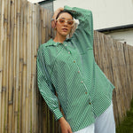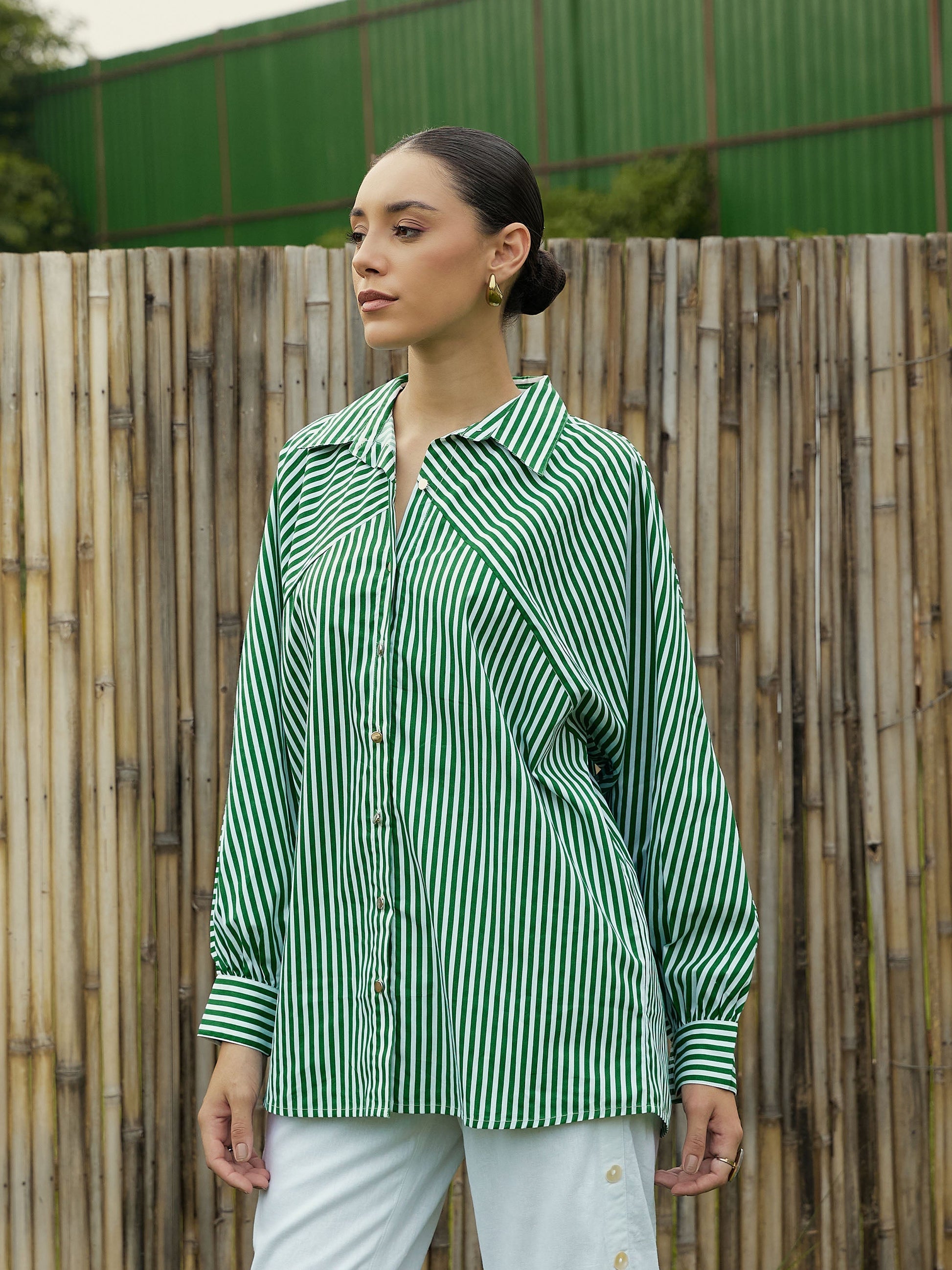 Green & White Stripe Oversized Shirt, in Cotton Poplin fabric, Unlined, Regular Length , Comfort Fit, Button Closure, Straight Hemline and features Golden Button At Front
