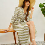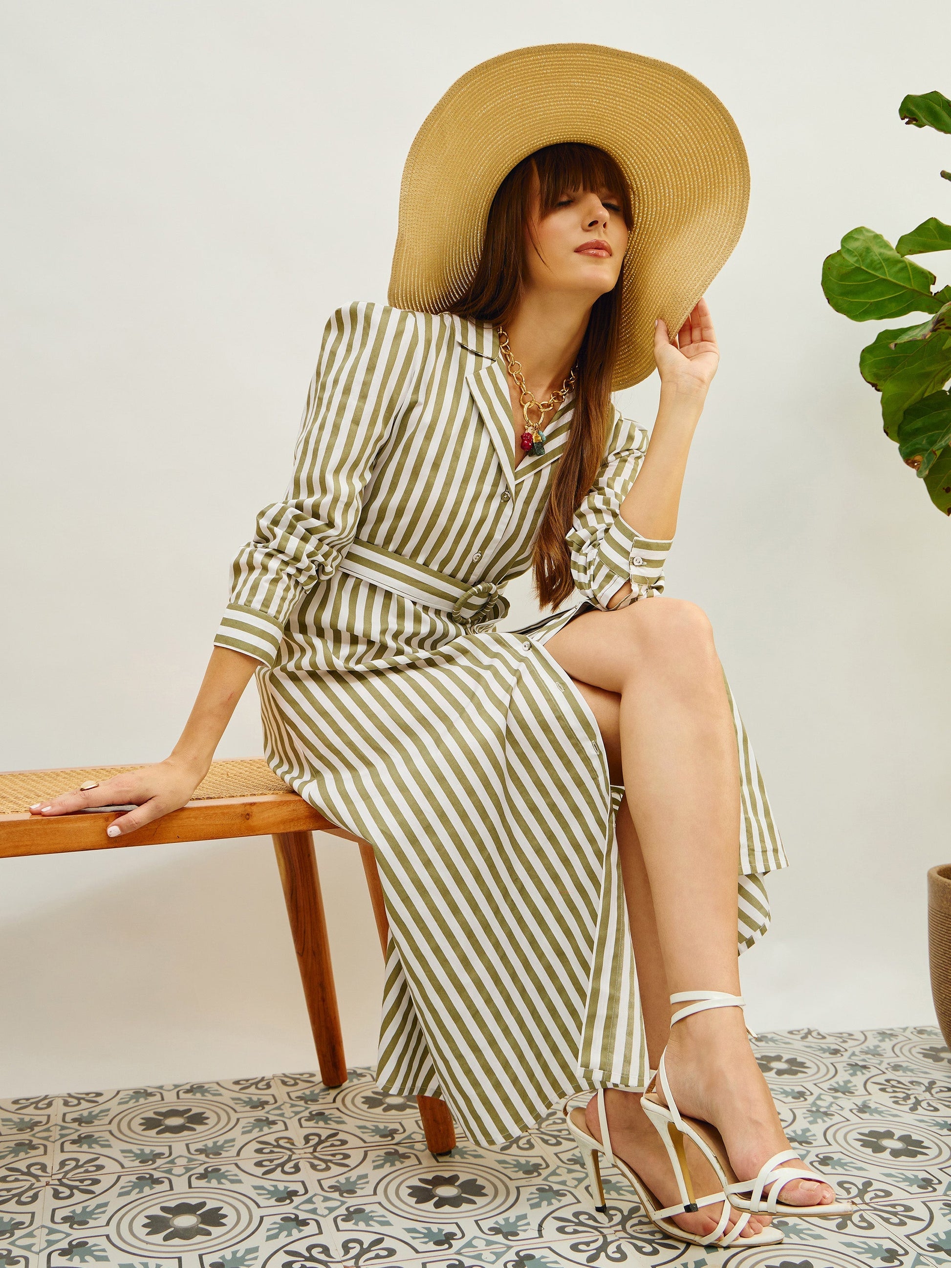 Green & White Striped Poplin Belted Shirt Dress, in Poplin fabric, Unlined, Below Knee, Regular Fit, Button Closure, Straight Hemline and features Fabri Belt At Waist
