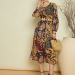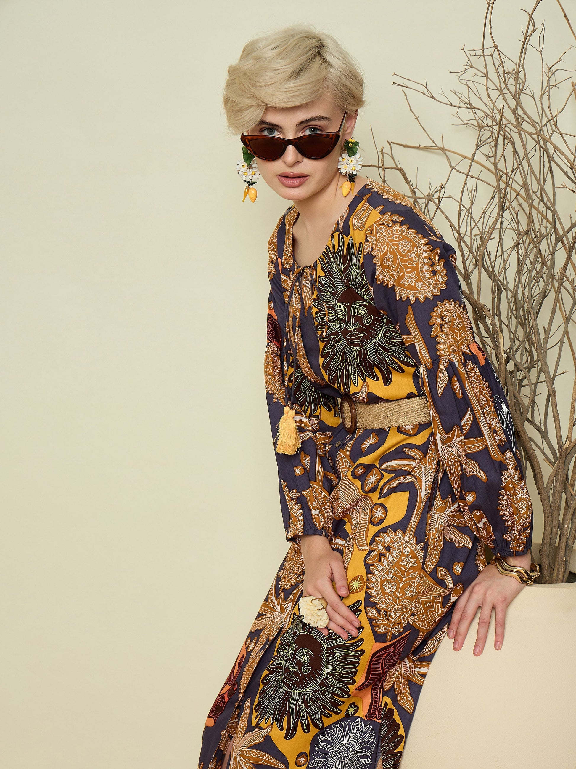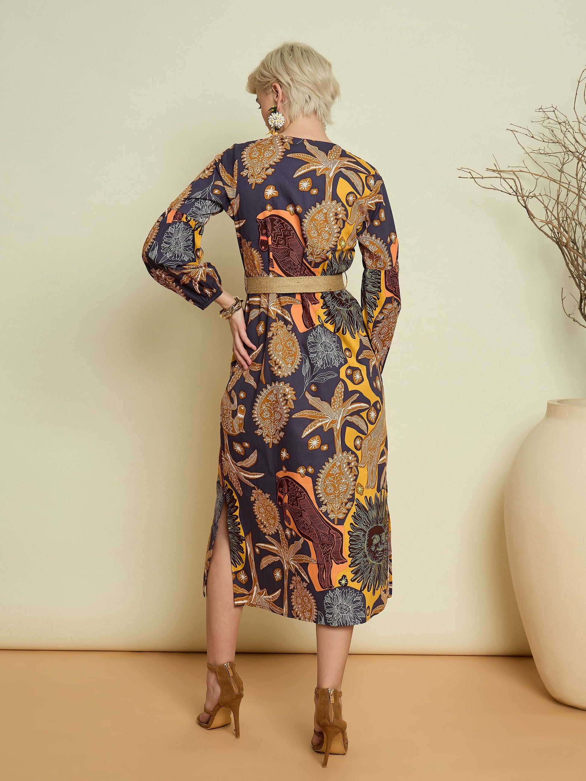 Grey Boho Printed Side Slit Midi Dress, in Cotton Poplin fabric, Unlined, Midi Length, Comfort Fit, Button/Drawstring Closure, Straight Hemline and features Drawstring Detail At Neck