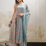 Grey Floral Sleeveless Kurta With Pencil Pants & Dupatta, in Cotton Cambric fabric, Unlined, Midi Length, Comfort Fit, Zipper Closure, Flared Hemline and features Zipper Detail At Back