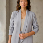 Grey Lapel Collar Front Open Blazer, in Marina fabric, Polycrepe lining, Regular Length, Regular Fit, No Closure, Asymmetric Hemline and features Shawl Collar Neck