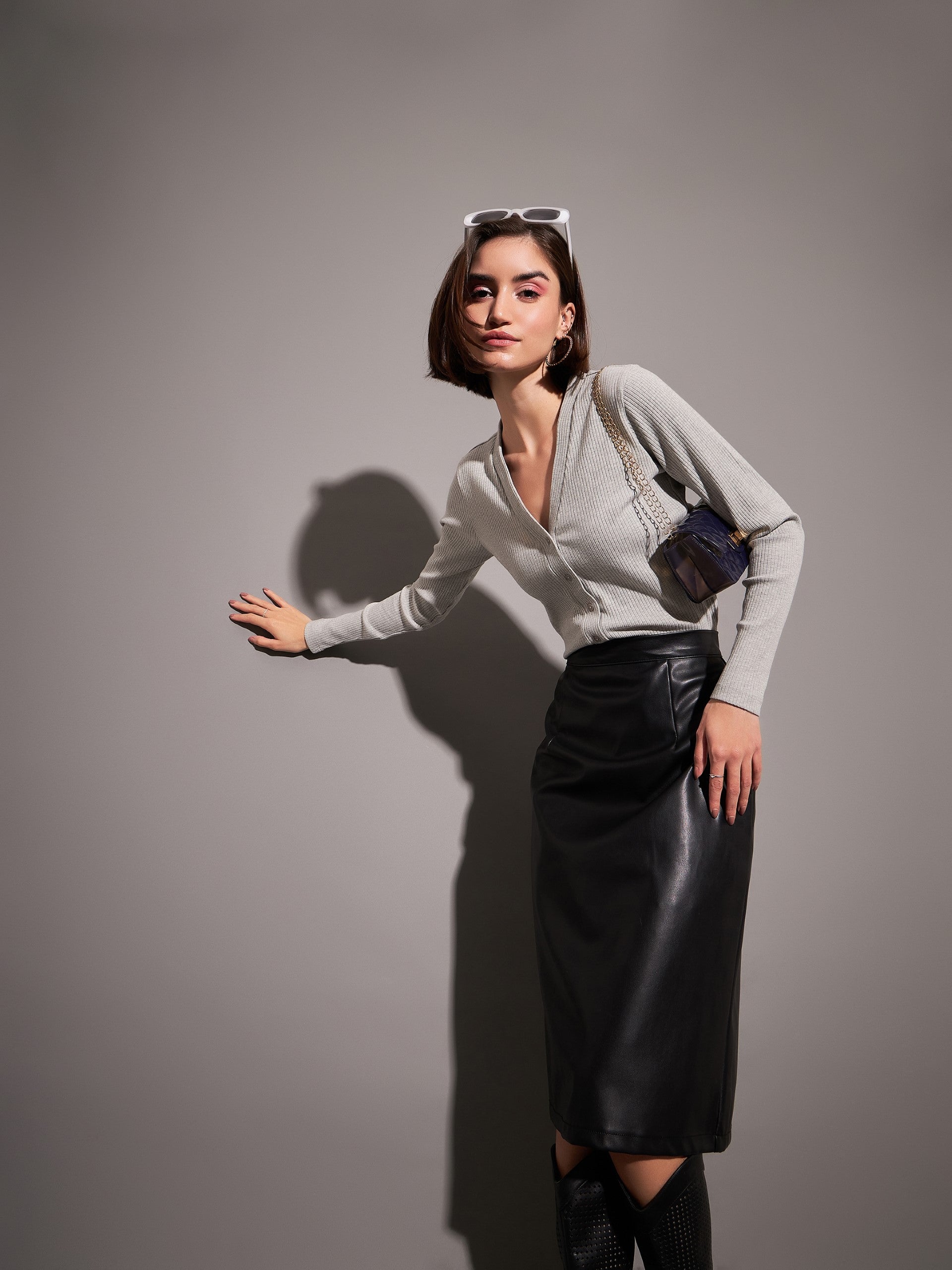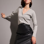 Women Grey Rib Front Open Cardigan Top