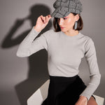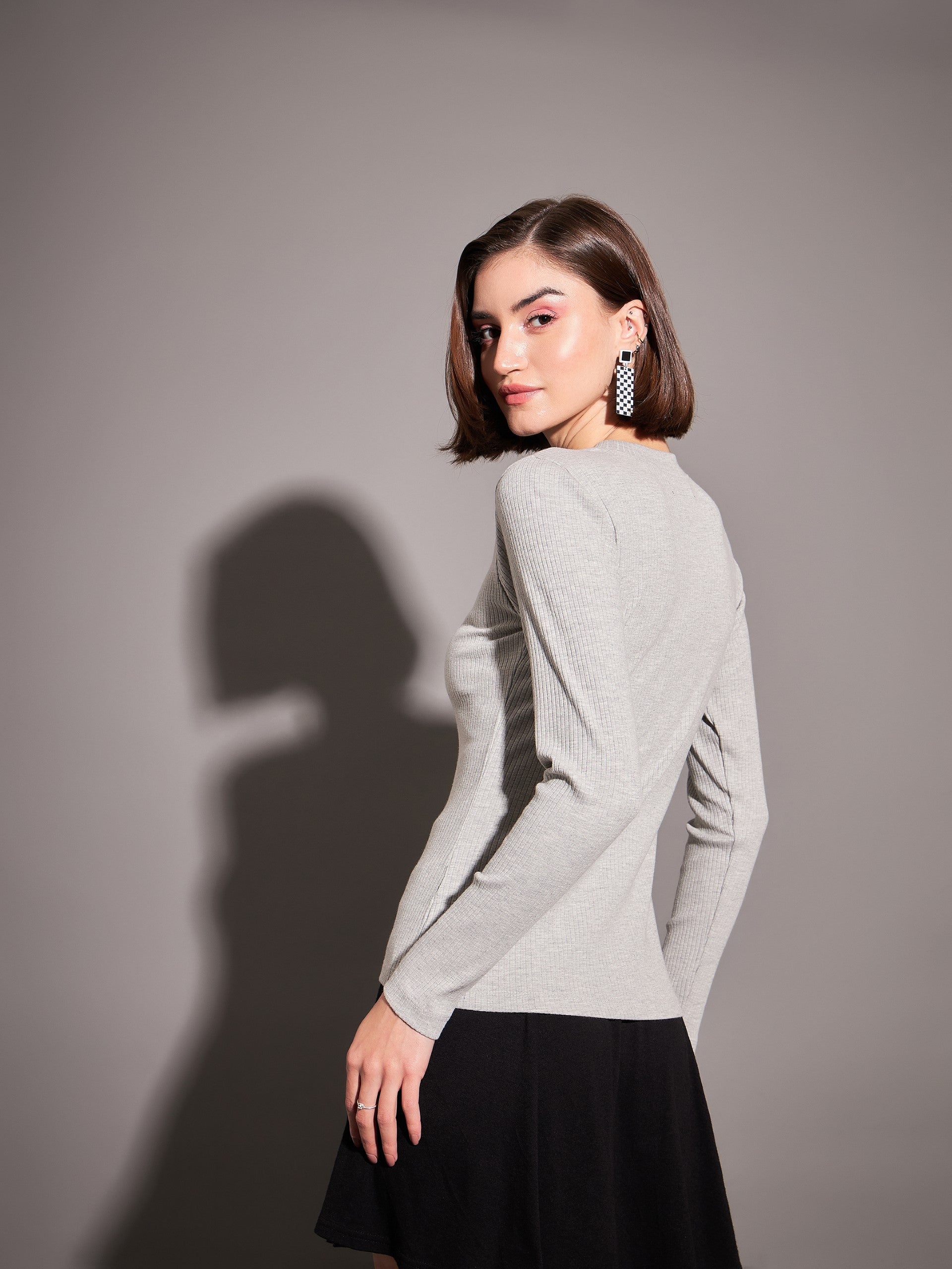 Grey Rib High Neck Top, in Rib fabric, Unlined, Regular Length, Slim Fit, No Closure, Straight Hemline and features Self Rib Design