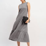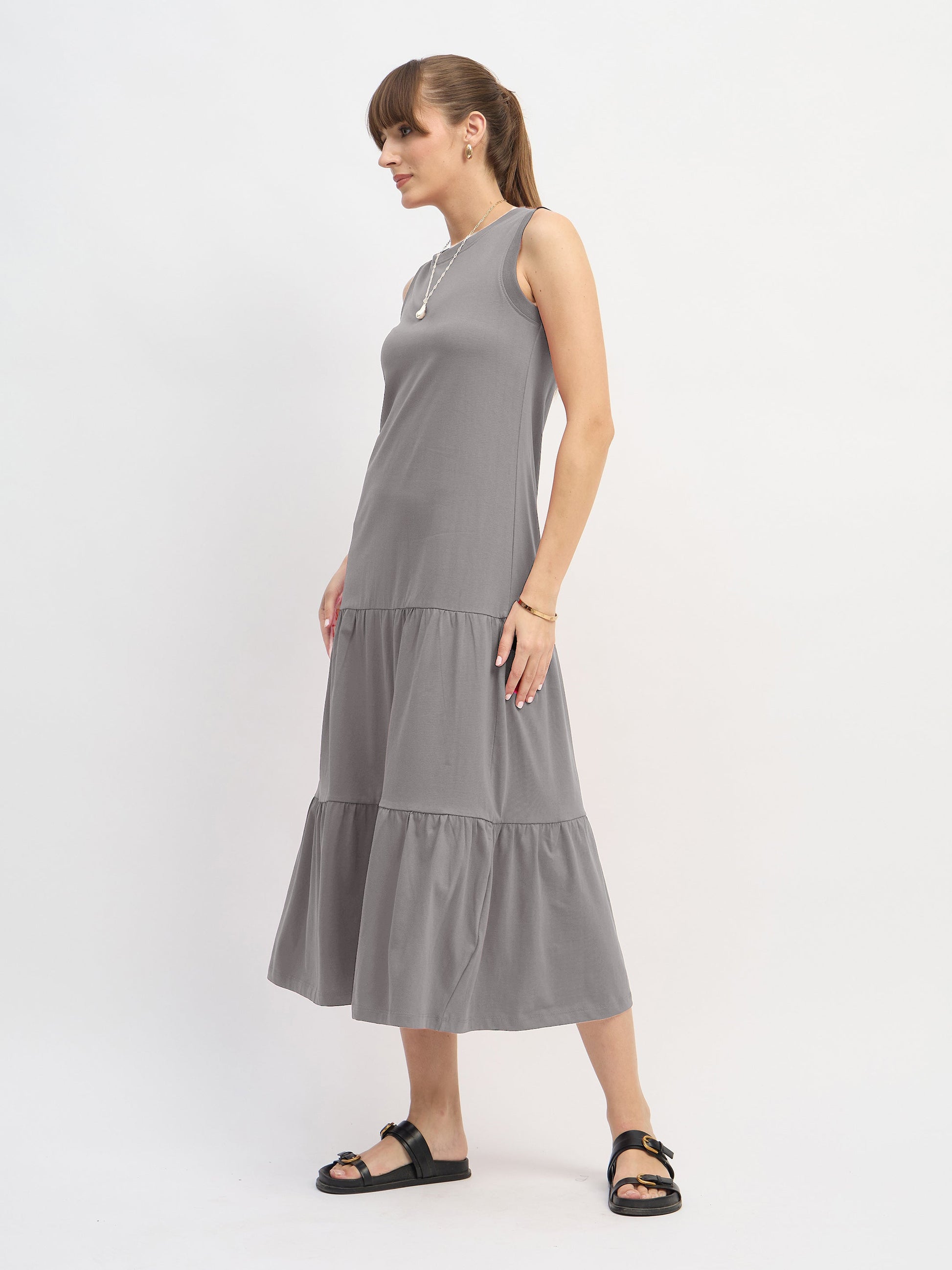 Grey Sleeveless Tiered Midi Dress, in Jersey fabric, Unlined, Below Knee, Fit & Flare, NA, Flared Hemline and features Rib At Neck & Sleeve