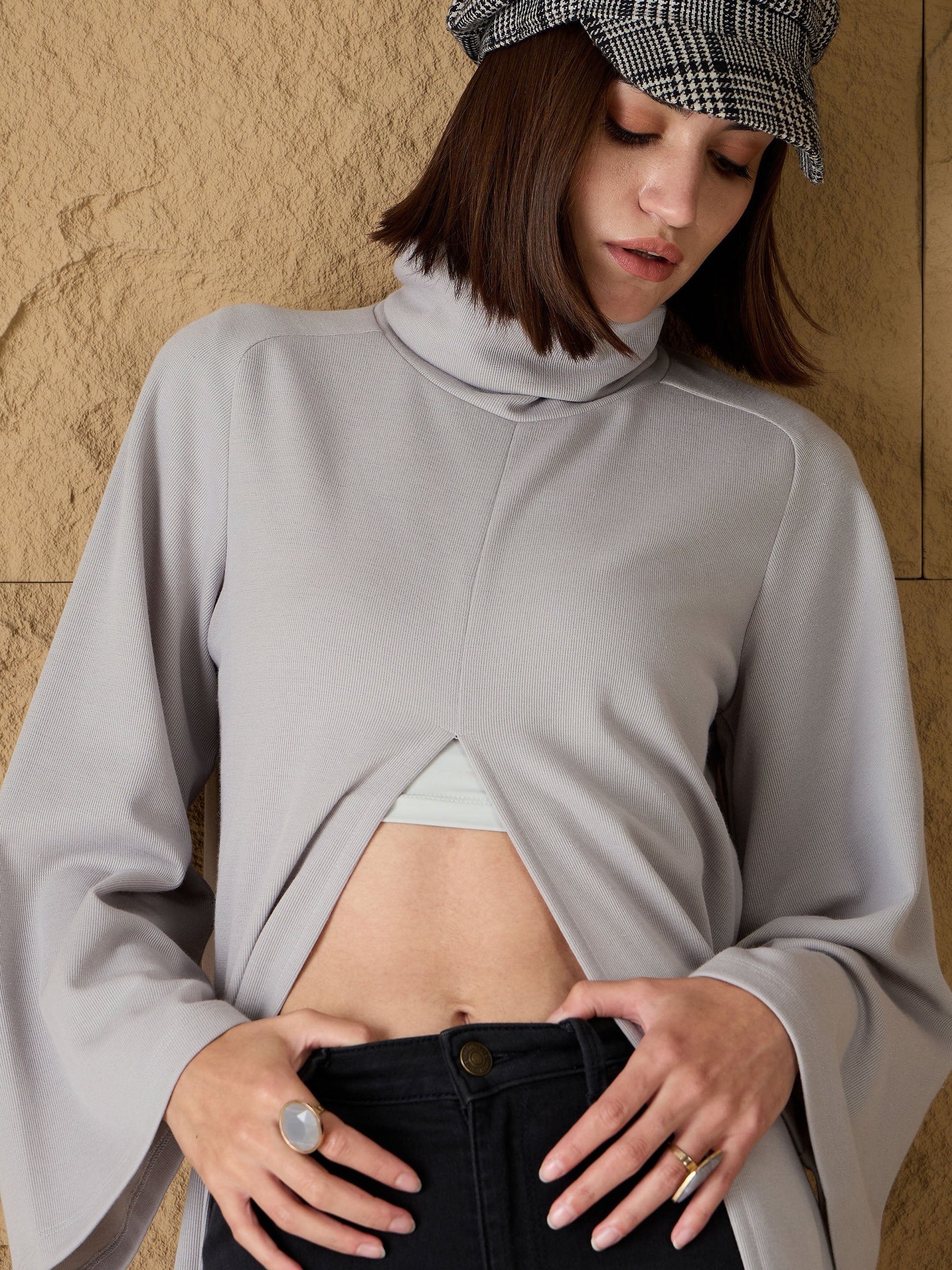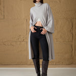 Grey Turtle-Neck Front High Slit Sweater, in Flat Back Winter Rib fabric, Unlined, Below Knee, Comfort Fit, No Closure, Straight Hemline and features High Slit At Front