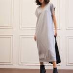 Grey V-Neck Sweater Dress, in Flat Back Winter Rib fabric, Unlined, Below Knee, Comfort Fit, No Closure, Straight Hemline and features Rib At Botoom