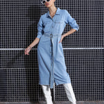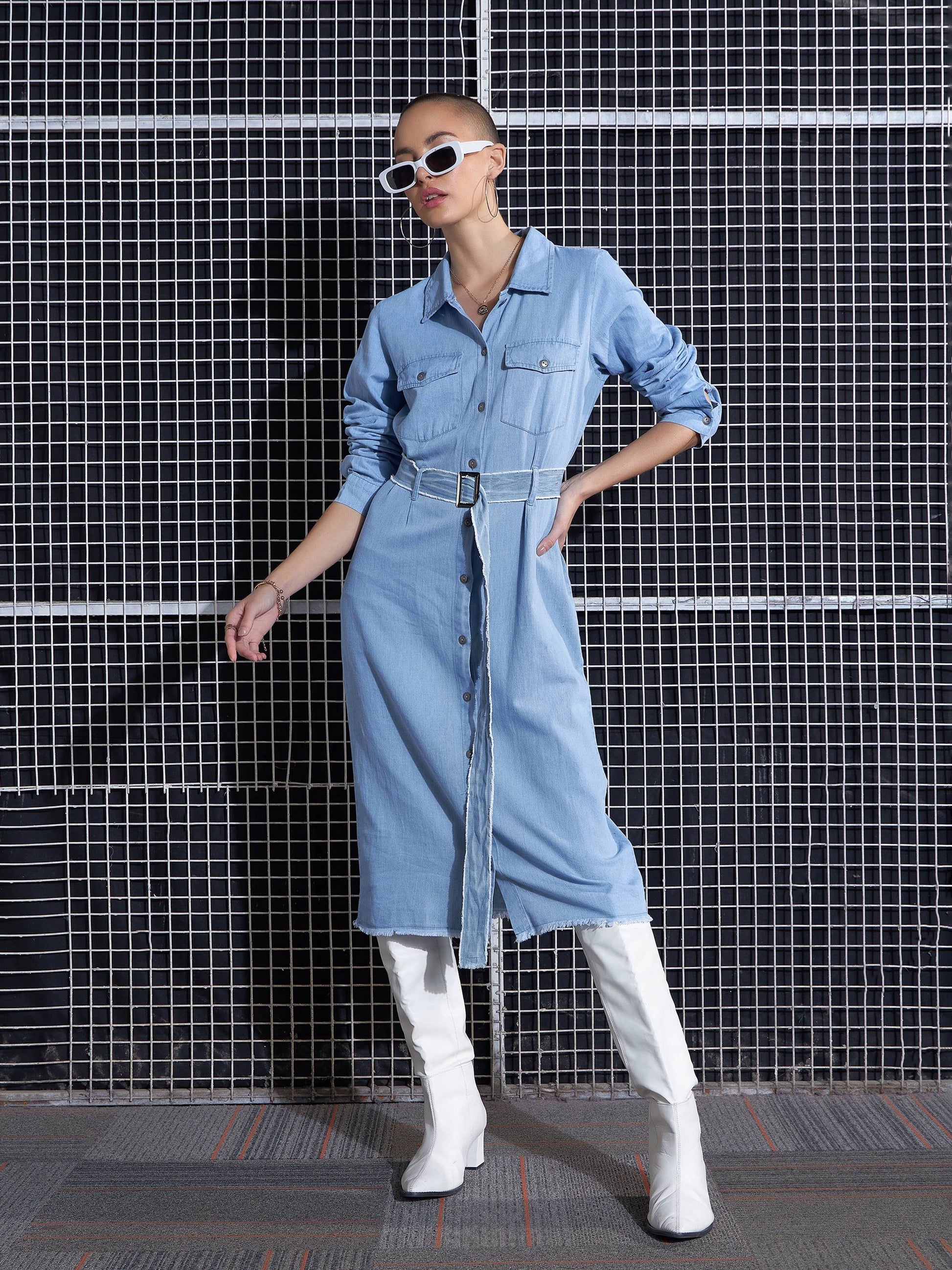 Women Ice Blue Raw Edge Pocket Shirt Dress