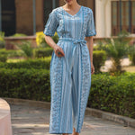 Sky-Blue Cotton Flex Jamdani Printed Jumpsuit