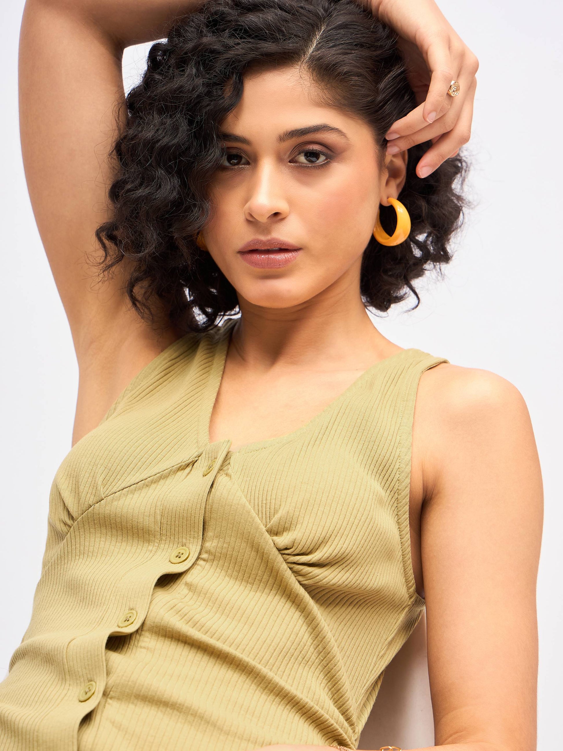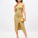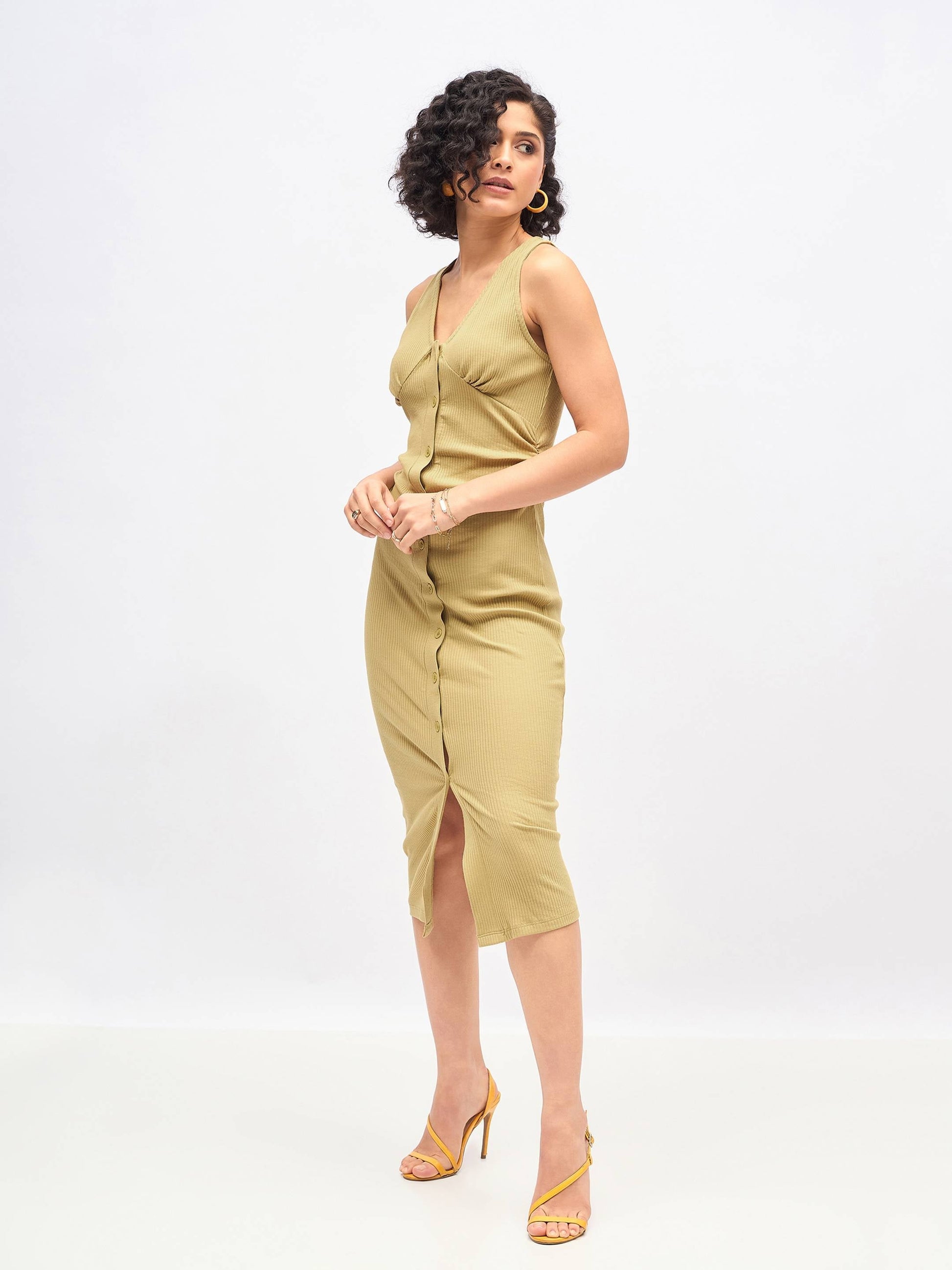 Women Khaki Rib Front Button Bodycon Midi Dress