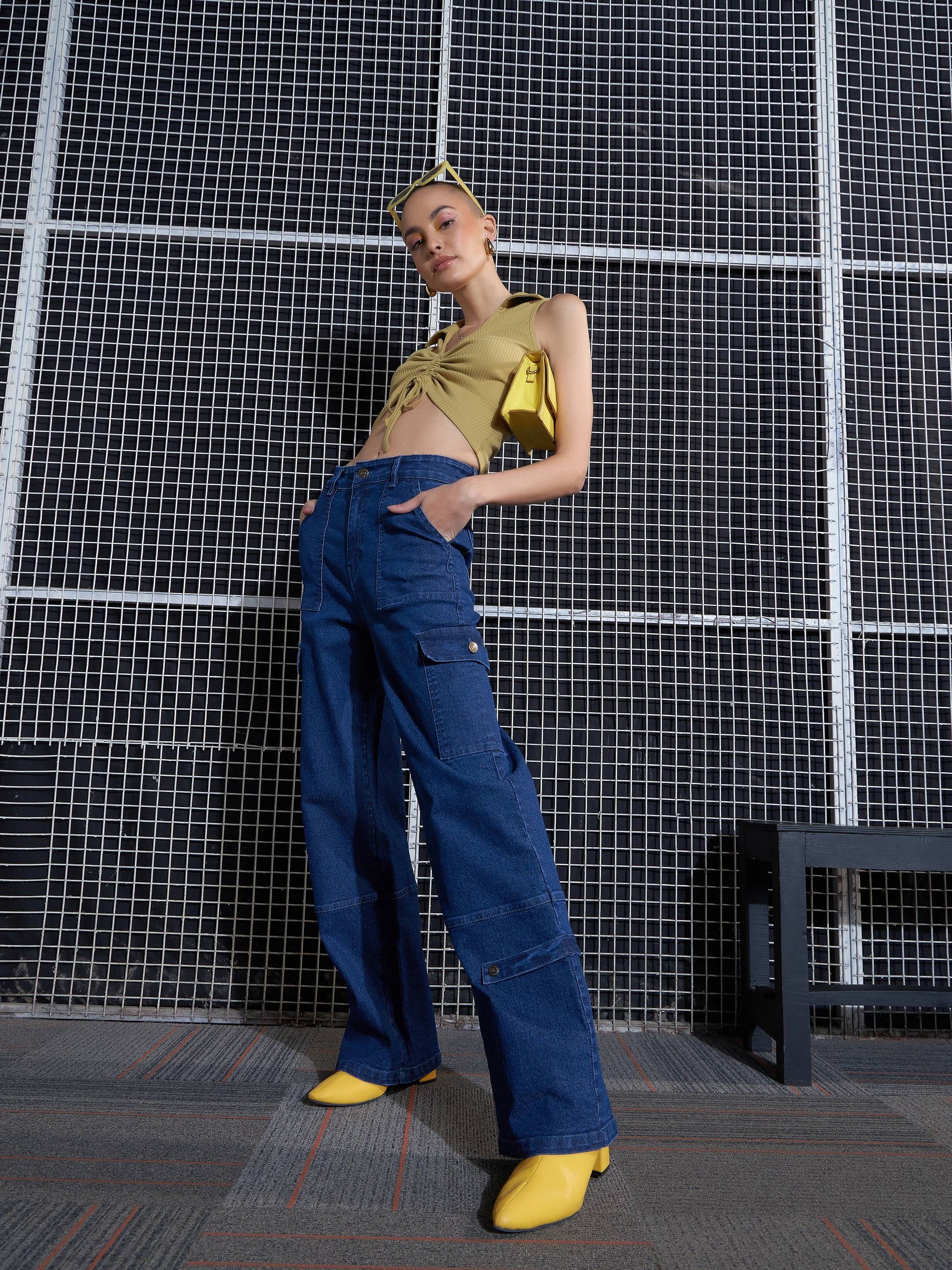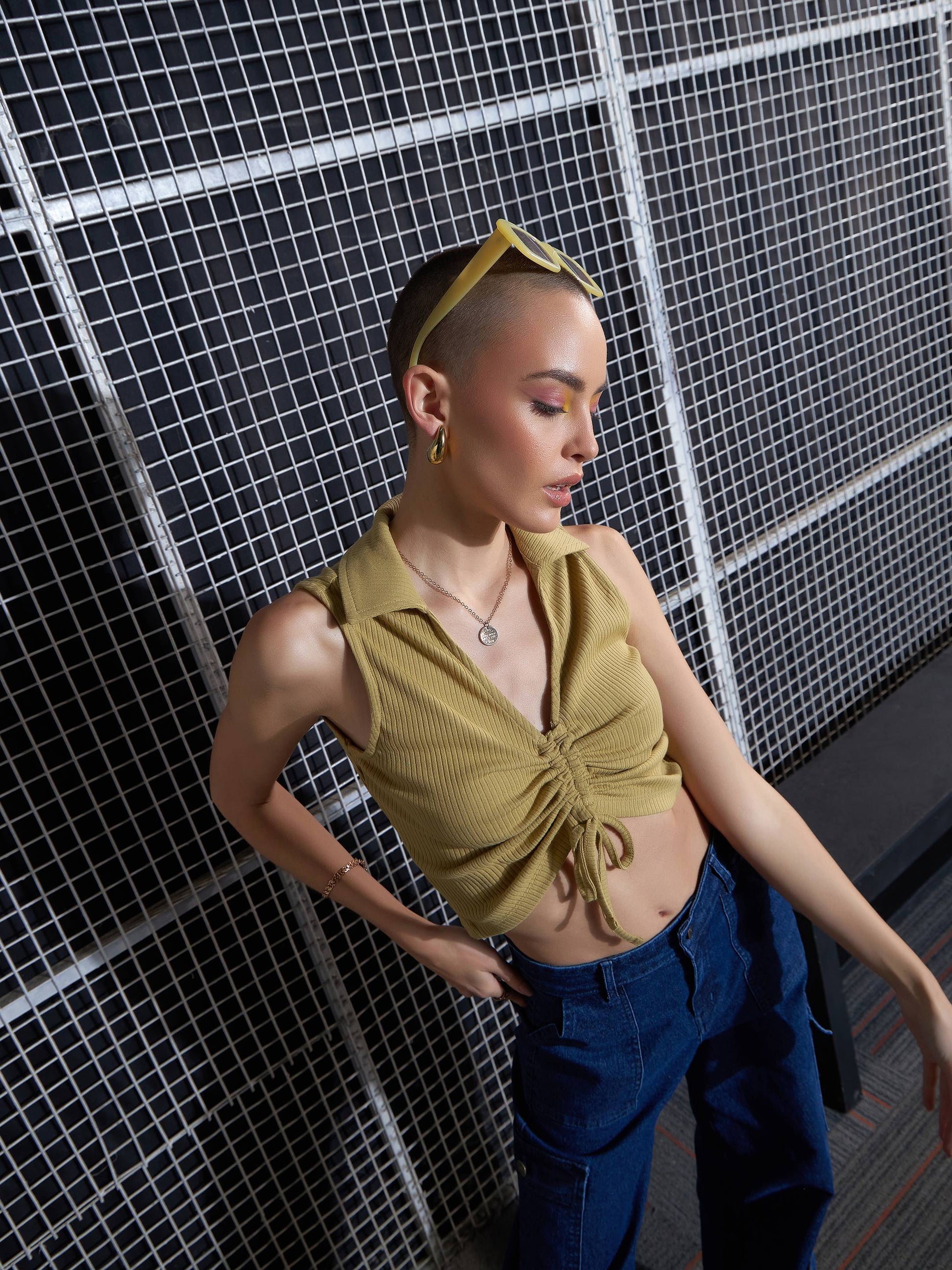 Khaki Rib Front Rouched Tank Top , in Rib fabric, Casual , Crop Length, No Closue, Unlined , Dori Detail At Front Hemline and features NA