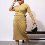 Khaki Rib Side Knot Bodycon Midi Dress, in Rib fabric, Unlined, Midi Length, BodyCon Fit, No Closure, Straight Hemline and features