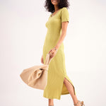 Khaki Rib Square Neck Midi Dress, in Rib fabric, Unlined, Midi Length, Slim Fit, No Closure, Straight Hemline and features Back Slit Detail