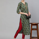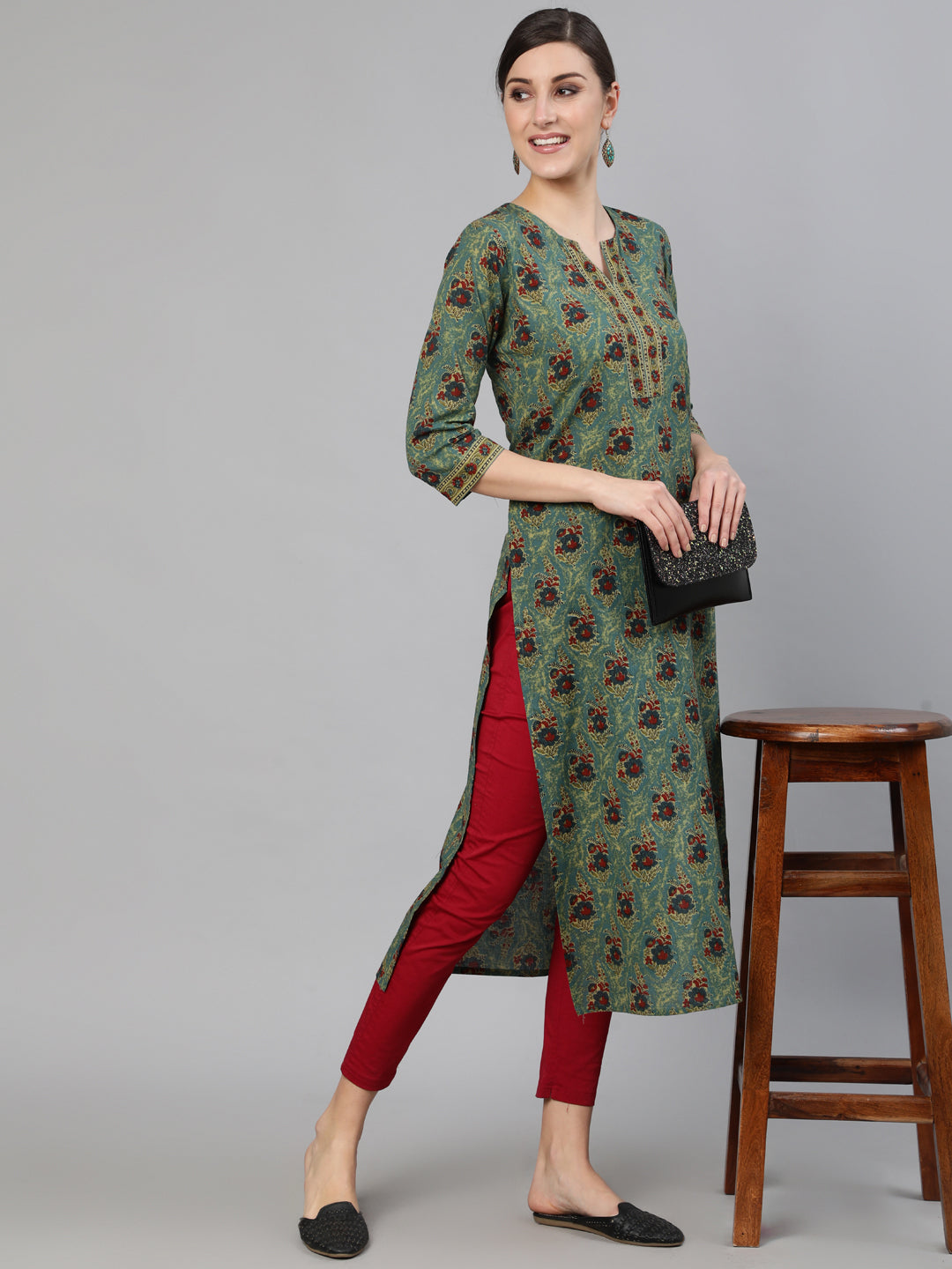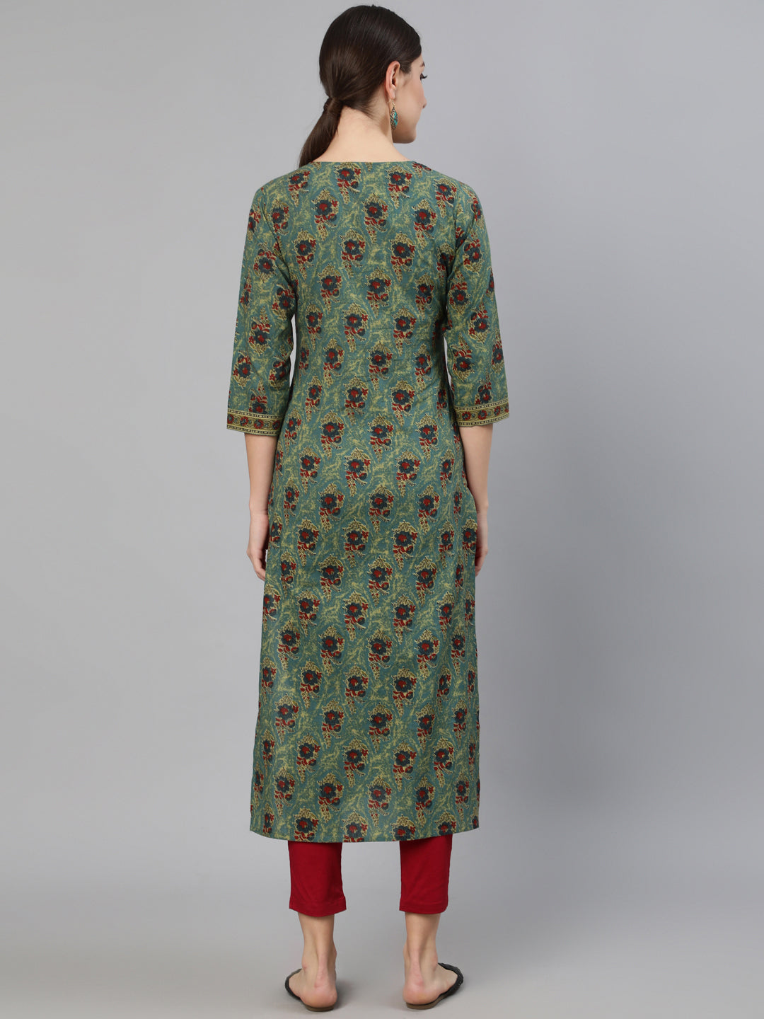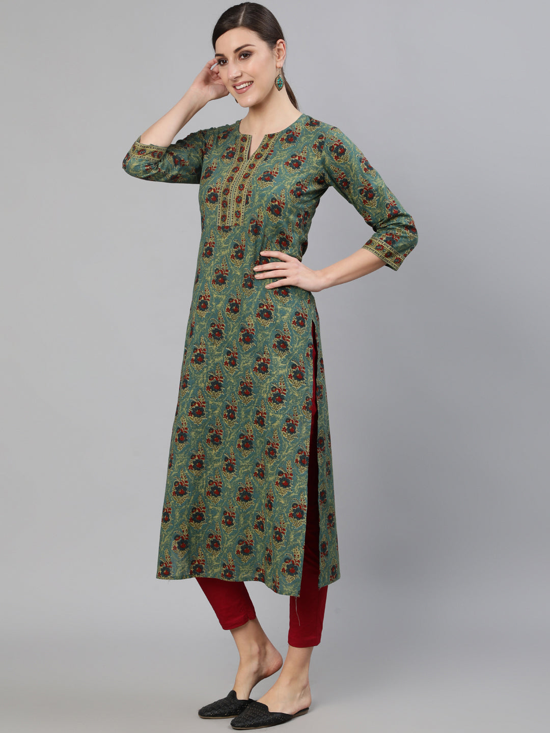 Women Blue Printed Straight Kurta With Three Quarter Sleeves
