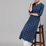 Women Navy Blue Ethnic Printed Straight Kurta With Three Quarter Sleeves