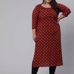 Plus Size Maroon Printed Straight kurta with Three Quarters Sleeves