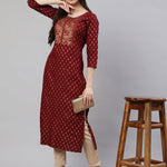 Maroon Printed Straight Kurta With Three Quarter Sleeves
