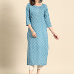 Women Blue Ethnic Printed Straight Kurta with Three Quarter Sleeves