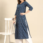 Women Blue Ethnic Printed Straight Kurta with Three Quarter Sleeves