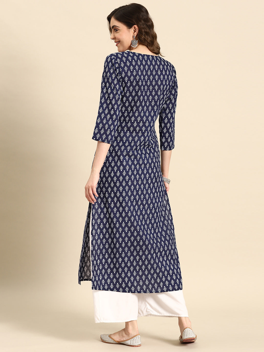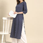 Women Blue Ethnic Printed Straight Kurta with Three Quarter Sleeves