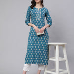 Women Blue Ethnic Printed Straight Kurta with Three Quarter Sleeves