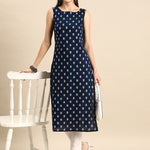 Navy Blue Ethnic Printed Straight Sleeveless Kurta