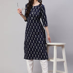 Navy Blue Printed Straight Kurta With Three Quarter Sleeves