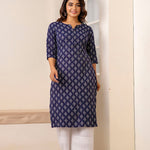 Navy Blue Printed Straight Kurta With Three Quarter Sleeves