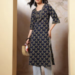 Blue Printed Straight Kurta with Three Quarter Sleeves