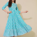 Cotton Ankle Length Printed Flared 3/4 Sleeves Round Neck Kurta