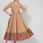 Cotton Calf Length Printed Flared 3/4 Sleeves Round Neck Kurta