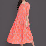 Printed Flared Calf Length 3/4 Sleeves Round Neck Cotton Kurta Dress