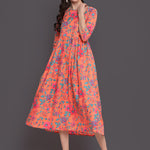 Printed Flared Calf Length 3/4 Sleeves Round Neck Cotton Slub Kurta Dress