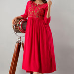 Embroidered Flared Calf Length 3/4 Sleeves Round Neck Rayon Kurta Dress