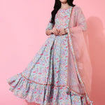 Cotton Full Length Flared 3/4 Sleeves Printed Round Neck Kurta And Dupatta Set