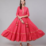 Cotton Ankle Length Bandhani Print Flared 3/4 Sleeve Collar Neck Kurta