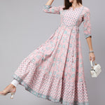 Cotton Ankle Length Printed Flared 3/4 Sleeve Round Neck Kurta
