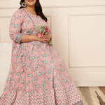 Cotton Calf Length Printed Flared 3/4 Sleeves Round Kurta