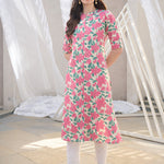 Pink Floral Printed Cotton Flax A-Line Kurta