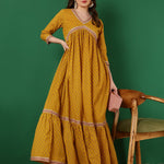 Cotton Printed Ankle Length 3/4 Sleeve V-Neck Alia Cut Tiered Kurta