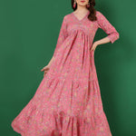 Cotton Printed Ankle Length 3/4 Sleeve V-Neck Alia Cut Tiered Kurta