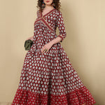 Rayon Printed Ankle Length 3/4 Sleeve V-Neck Alia Cut Tiered Kurta