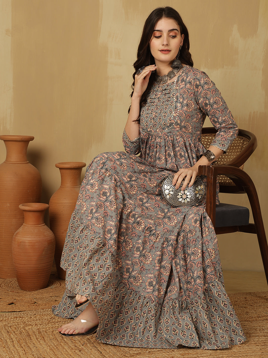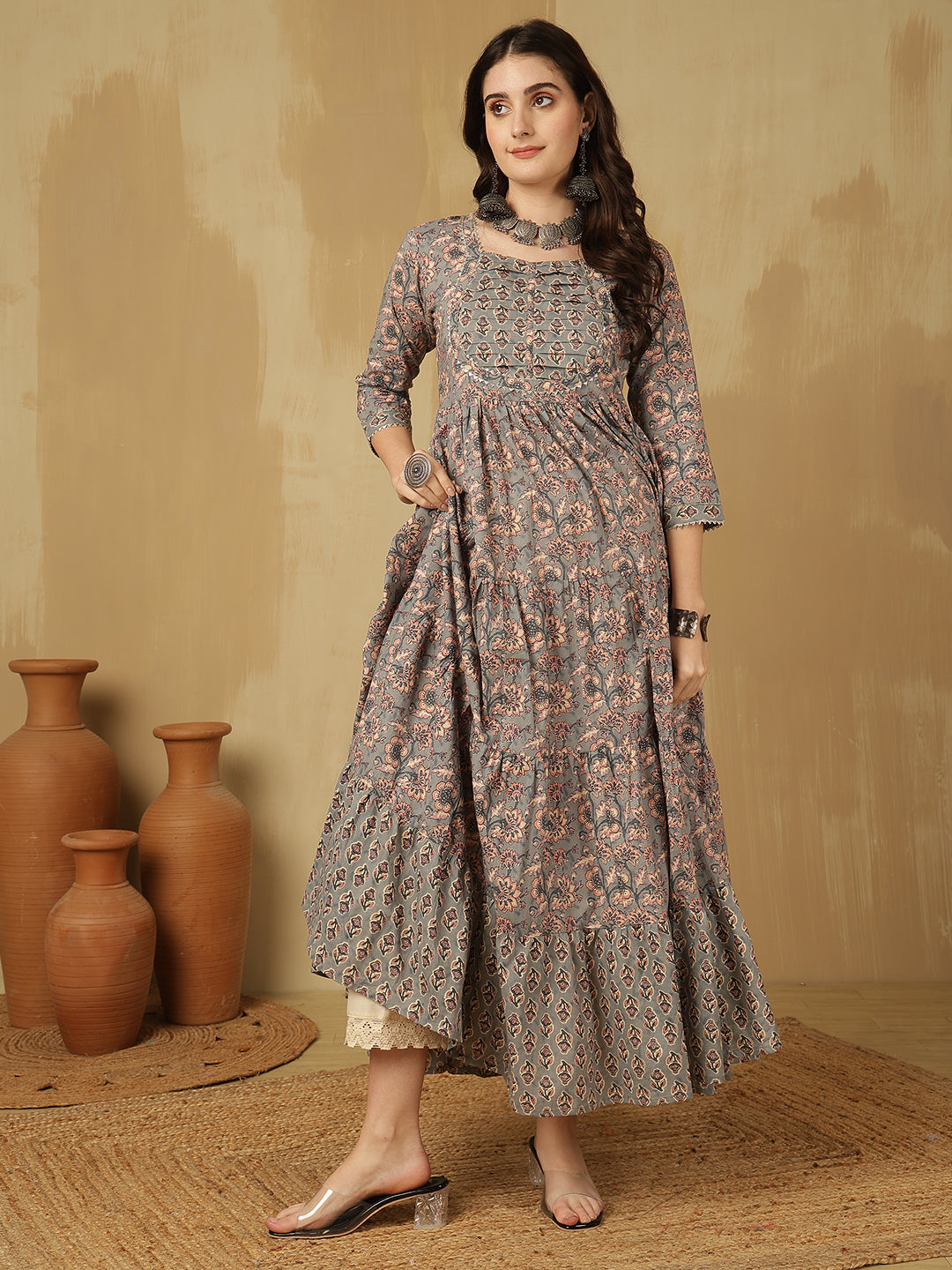 Women Cotton Printed Ankle Length Round Neck Tiered Kurta