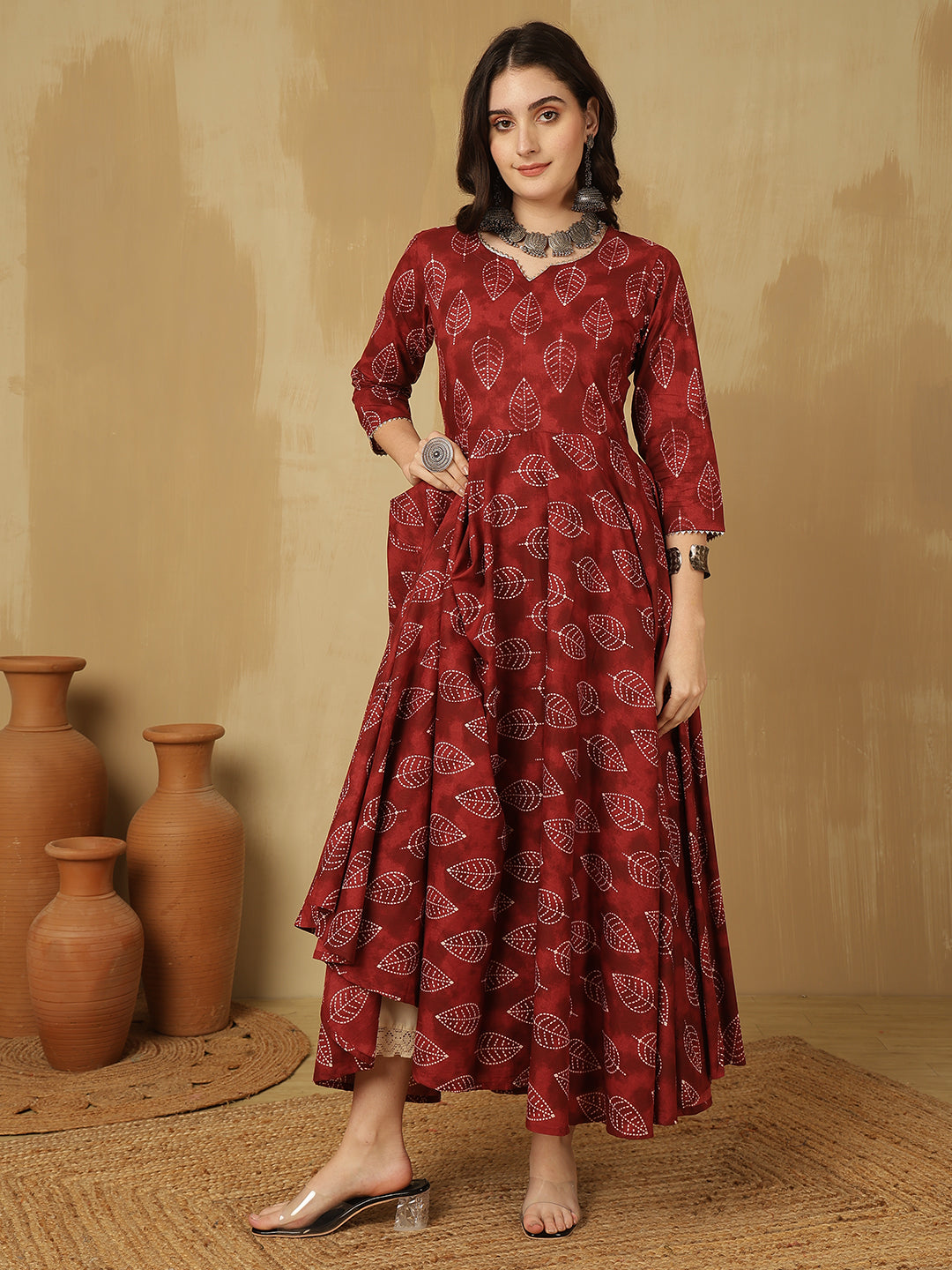 Women Cotton Printed Ankle Length V-Neck Anarkali Kurta
