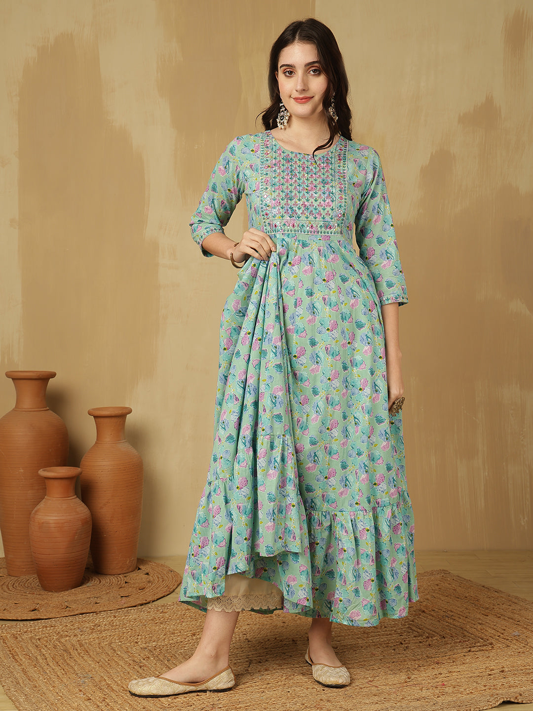 Women Embroidered Cotton Printed Ankle Length Round Neck Tiered Kurta