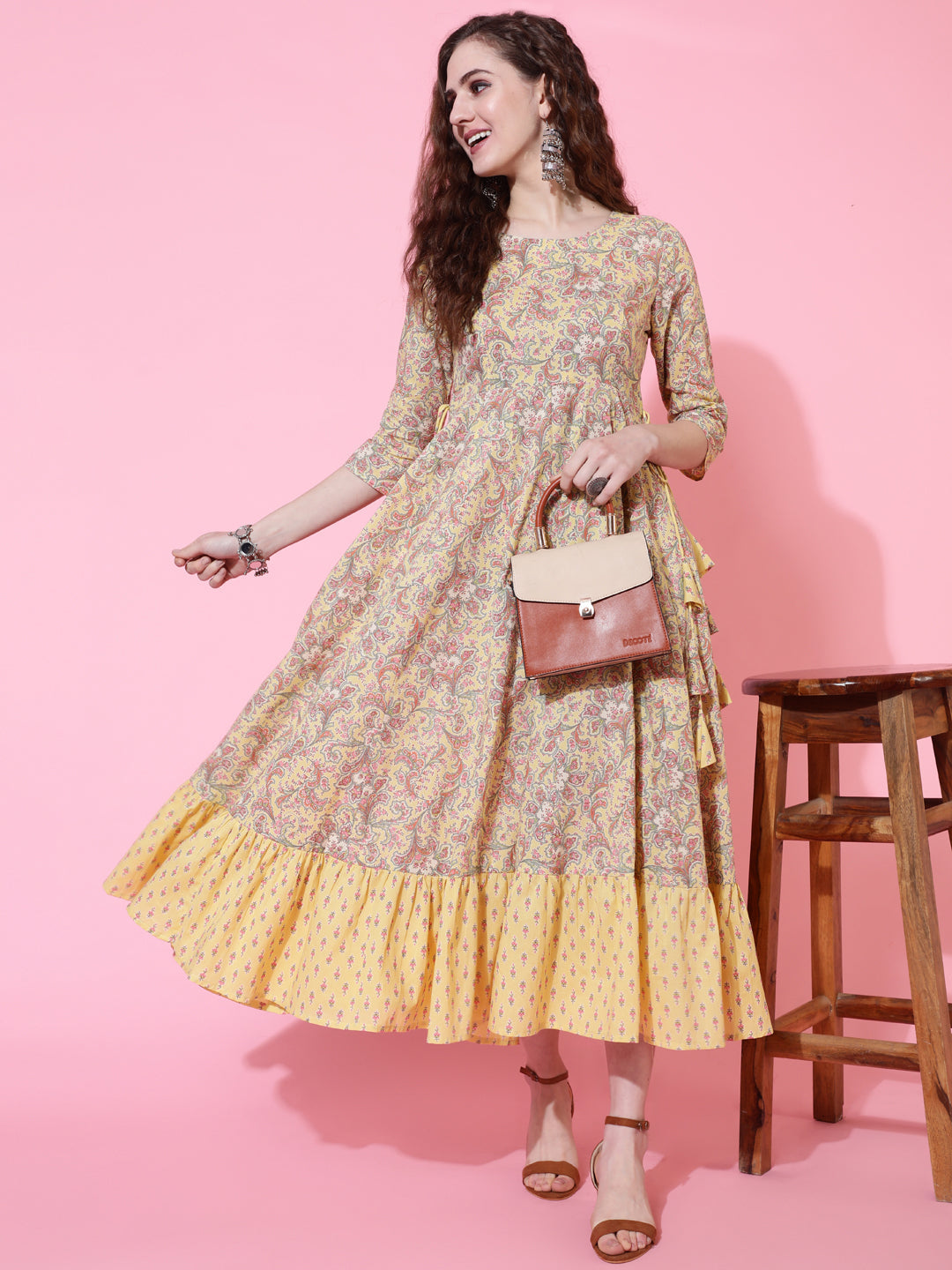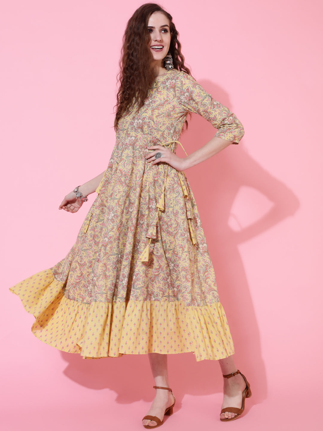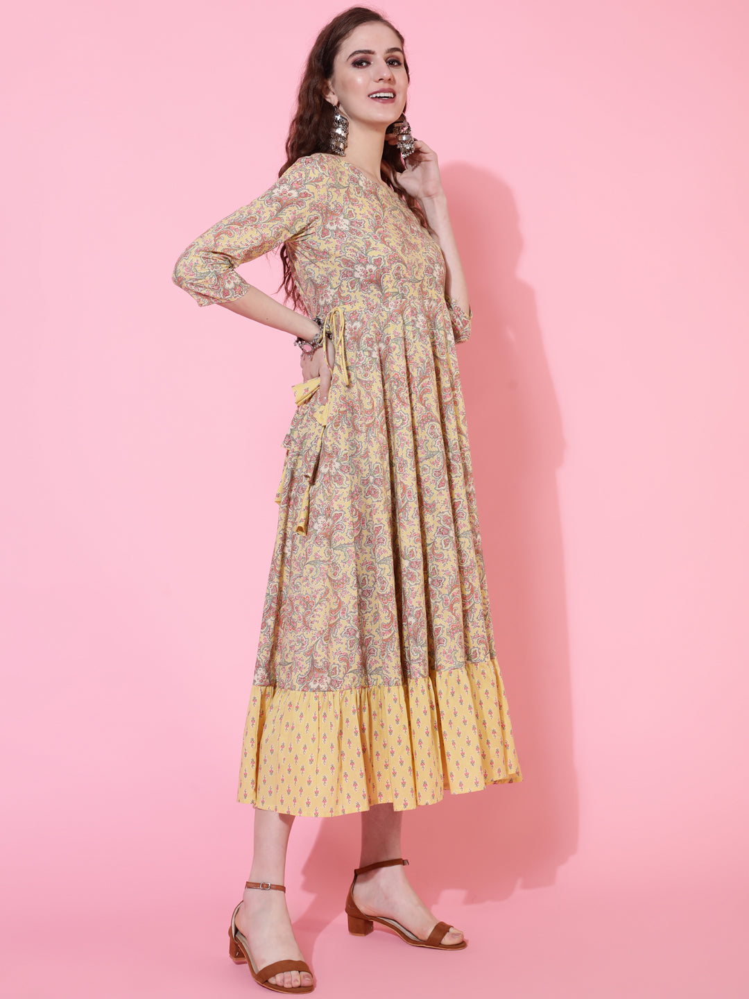 Cotton Printed Calf Length Flared 3/4 Sleeve Round Kurta