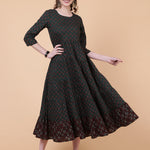 Cotton Calf Length Printed Flared 3/4 Sleeves Round Neck Kurta